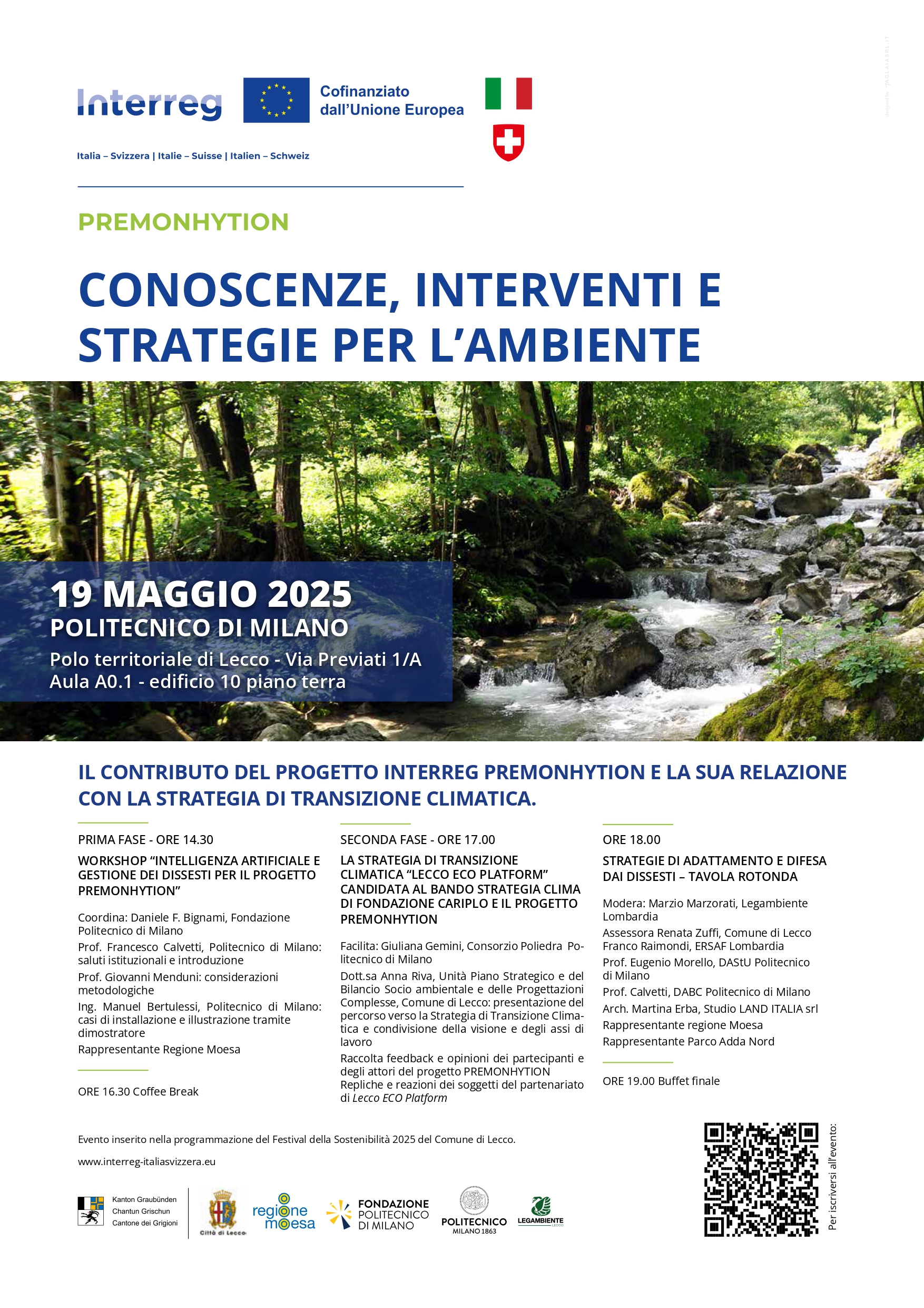 Tra gli appuntamenti in programma segnaliamo l'evento organizzato dal Comune di Lecco con Regione Moesa, Fondazione Politecnico, Politecnico di Milano e Legambiente Lecco sul tema “Conoscenze, interventi e strategie per l’ambiente. Il contributo del progetto Interreg PreMonHytIon e la sua relazione con la strategia di transizione climatica” che si terrà lunedì 19 maggio dalle 14.30 alle 19.00 presso il Politecnico di Milano - Polo territoriale di Lecco in Via gaetano PreviatiAula A0.1 - edificio 10, piano terra. L'ingresso è libero previa registrazione al form