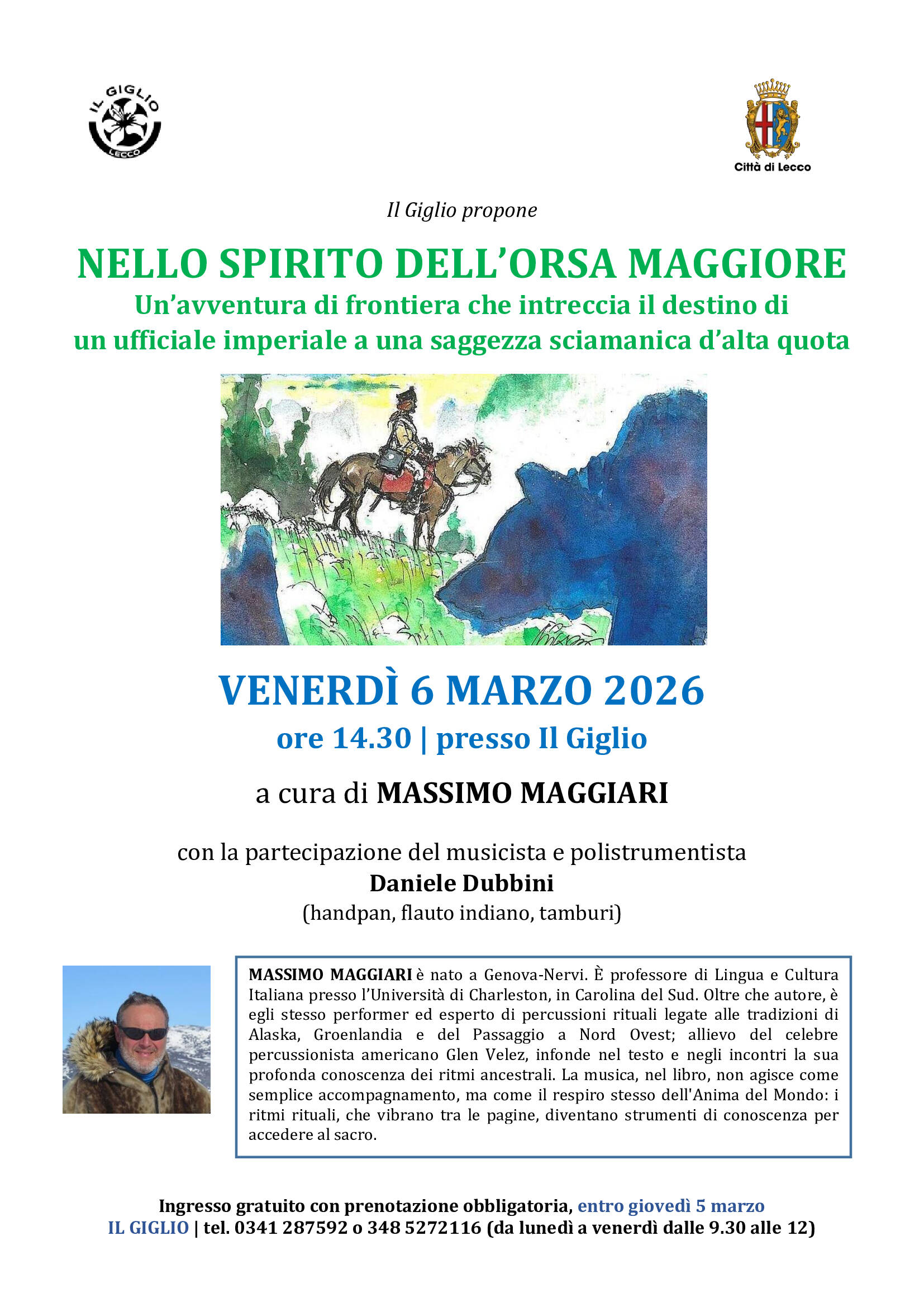 Venerdì 6 marzo alle ore 14.30 presso il Giglio, lo scrittore Massimo Maggiari propone un incontro dal titolo "Nello spirito dell'Orsa Maggiore", un'avventura di frontiera che intreccia il destino di un ufficiale imperiale a una saggezza sciamanica d'alta quota.