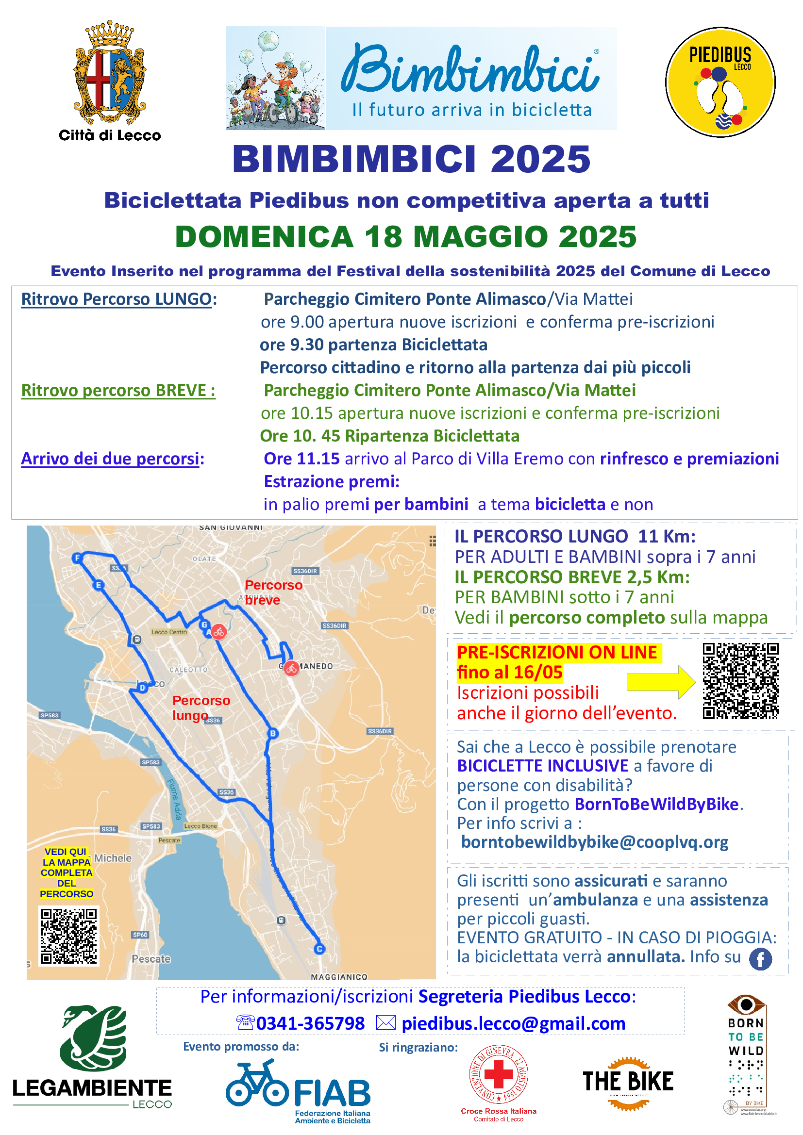 Tra gli appuntamenti del festival della Sostenibilità, il Comune di Lecco, in collaborazione con Legambiente, nell'ambito del progetto Piedibus, organizza domenica 18 maggio Bimbimbici, una biciclettata non competitiva.
